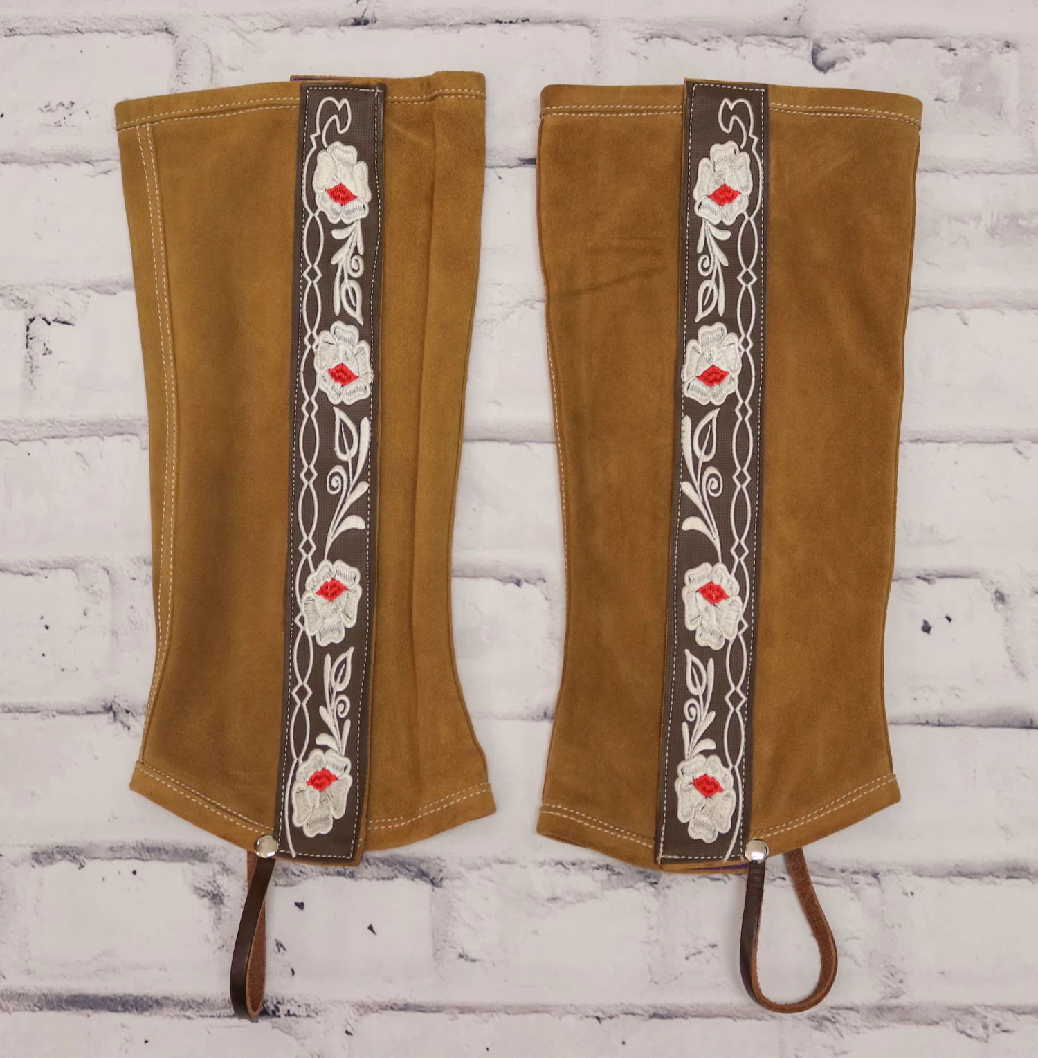 Soft Leather leggings featuring Velcro closures with beautiful custom design. Very comfortable and easy to take on and off, adjustable. Made in Mexico.