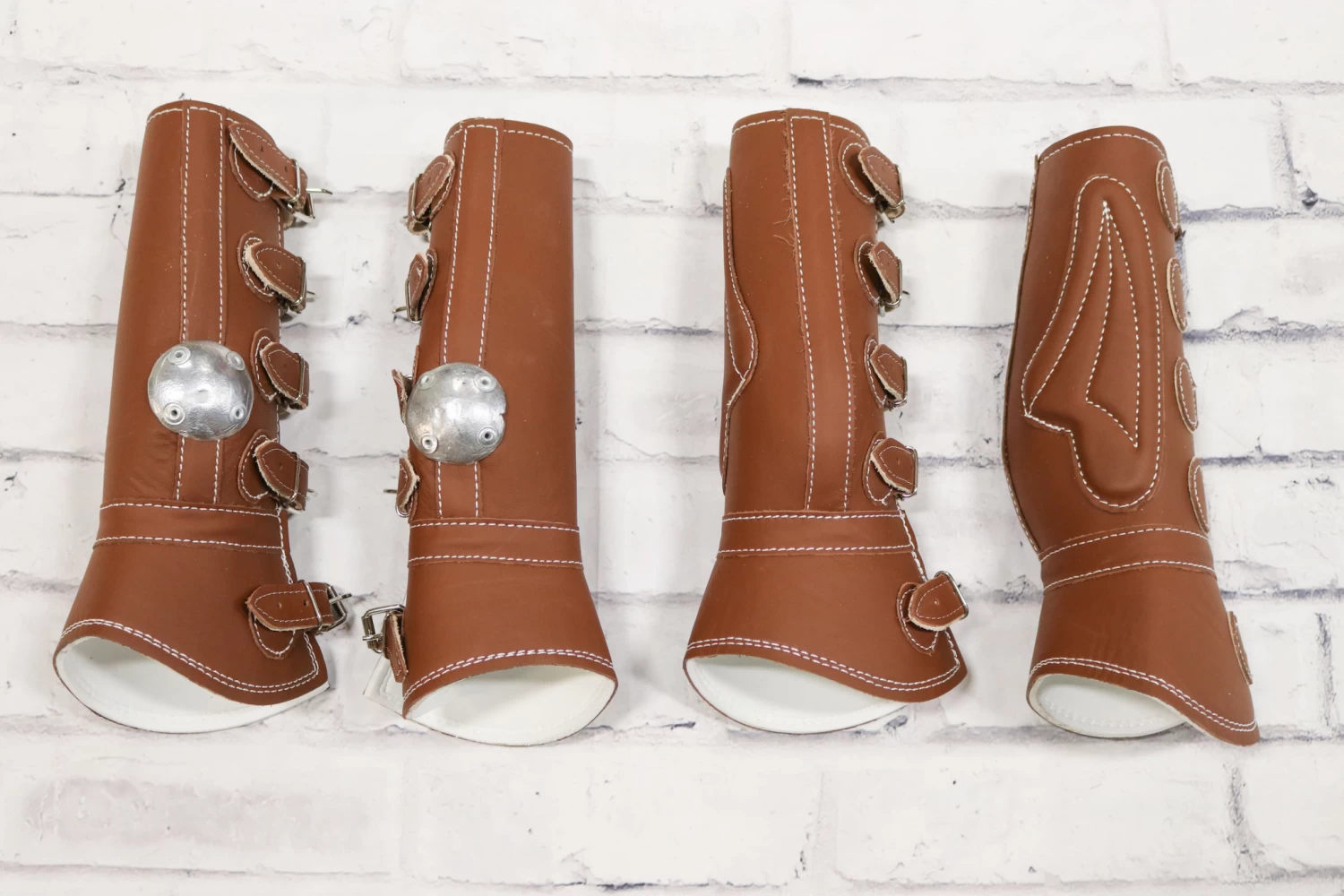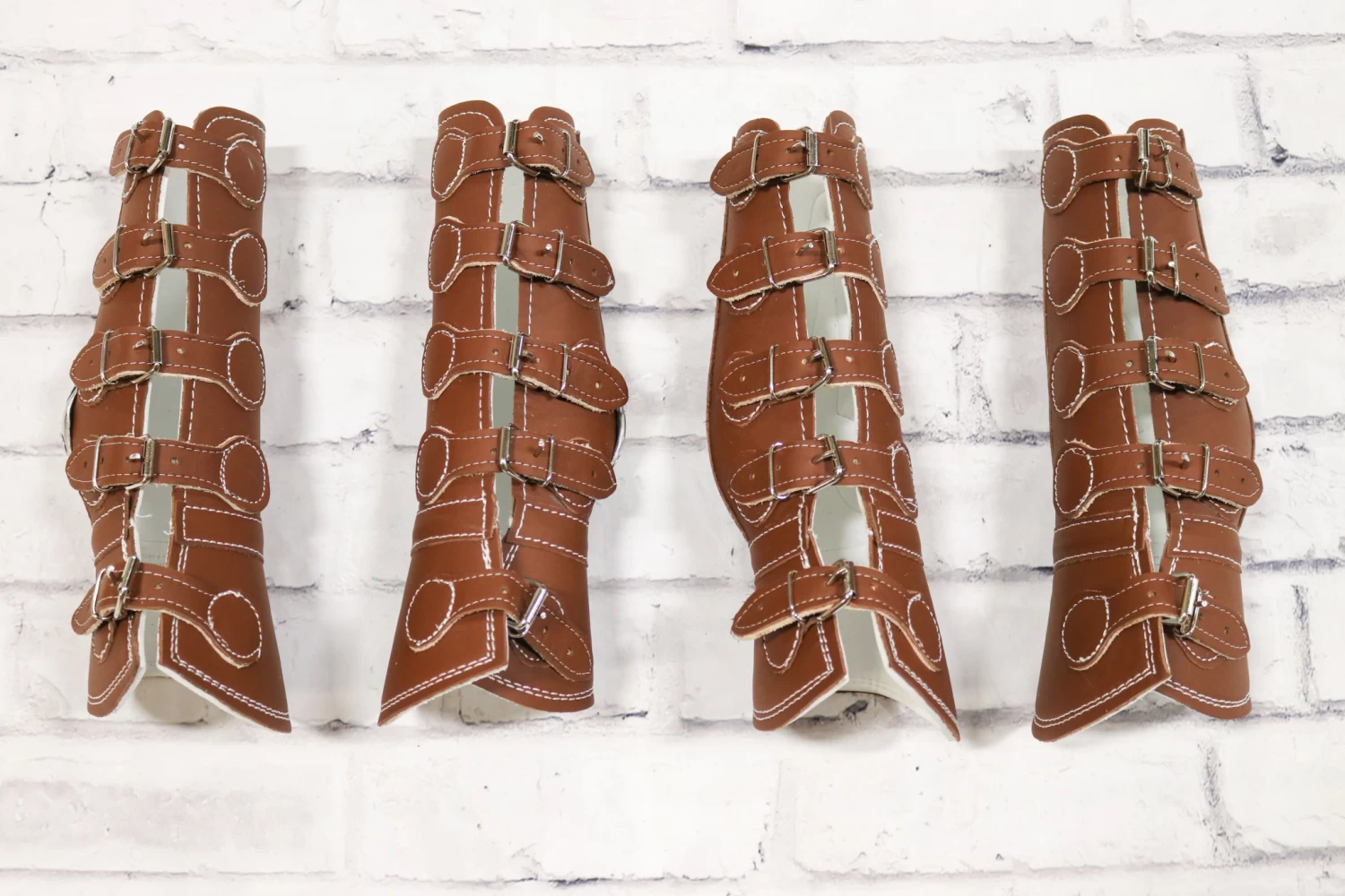 Leather boots composed of high quality leather with heavy duty buckles offering lower leg and hoof protection.(4) Front and back horse leg boots. Estas canilleras ofrecen proteccion a la pierna inferior y superior del casco . Este juego de protectores esta compueto de piel de calidad y cuenta con cierre de hebilla muy resistente. (4) Protectores delanteros y traseros para caballo.Â
