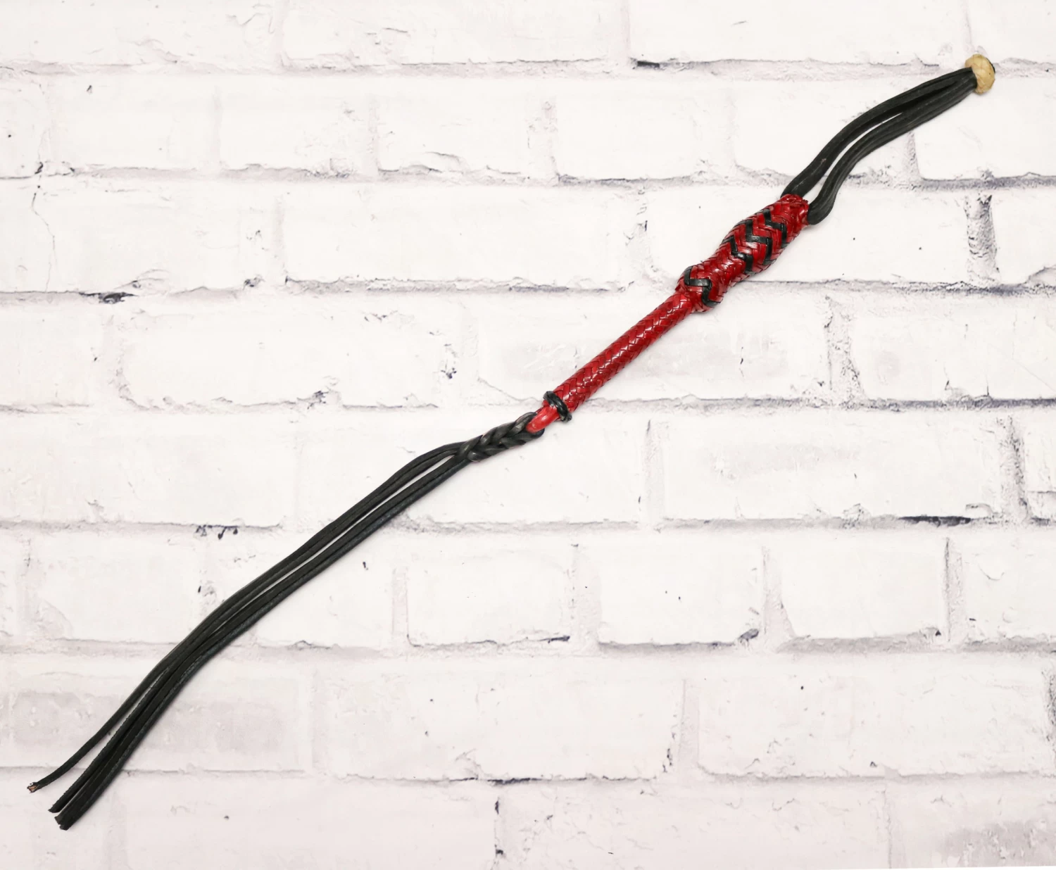 Braided rawhide leather contoured handle with leather wrist strap and two- strand lash.