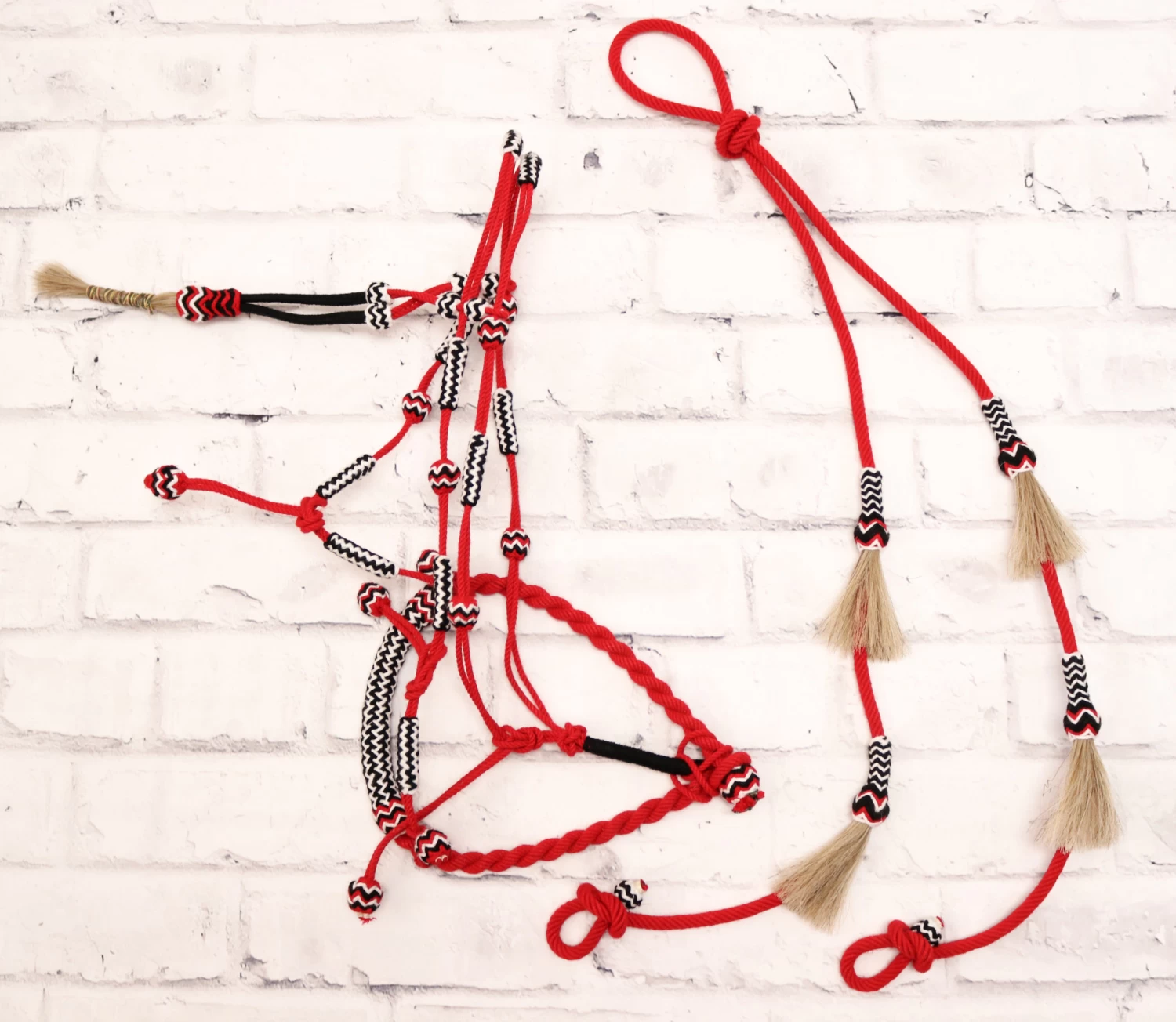 Bosalillo charro de algodon en color rojo. Viene bosal con riendas de buena calidad. Hecha en Mexico. Charro (red/black) cotton bosal with matching reins. Quality made in Mexico.