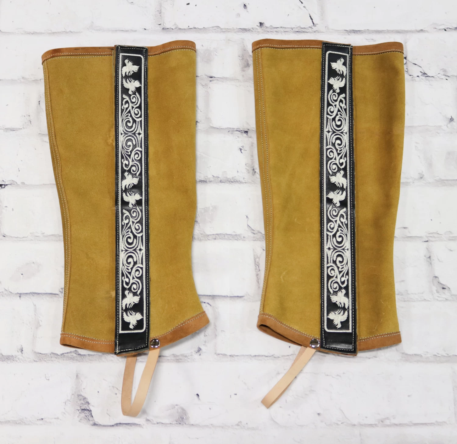 Soft suede Leather leggings featuring Velcro closures with beautiful custom design. Very comfortable and easy to take on and off, adjustable. Made in Mexico. Polainas de gamuza con cierres de velcro con diseño al lado. Muy cómodo y fácil de poner y quitar. Measurements: Size: Medium (mediano) Length(largo): 16.5″ Width: Adjustable (16″- 18″)