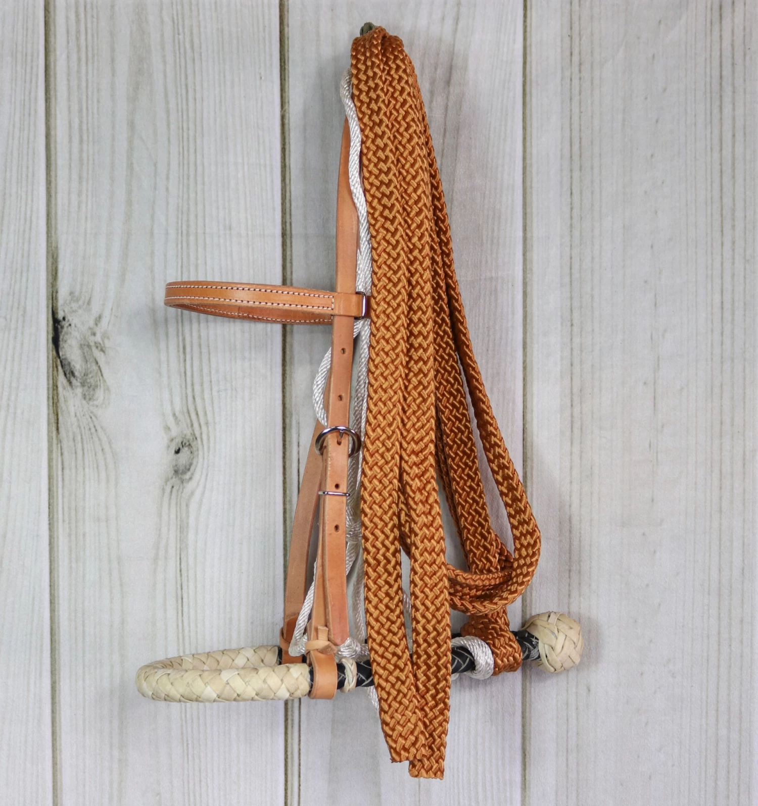 A breaking hackamore set that will stand up to hard to use. Leather browband headstall and soft nylon brown braided reins. Horse Size. Made in the USA.