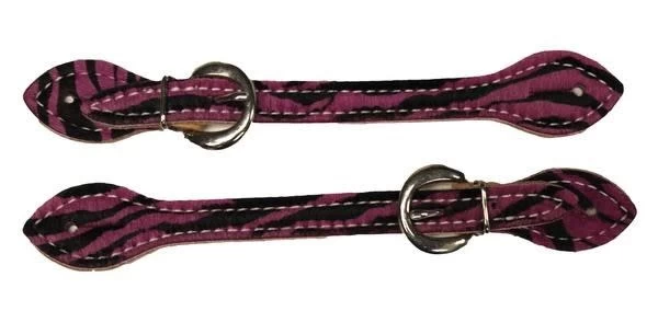 Pink zebra print hair on spur straps American made with nickel plated buckles, great quality leather.