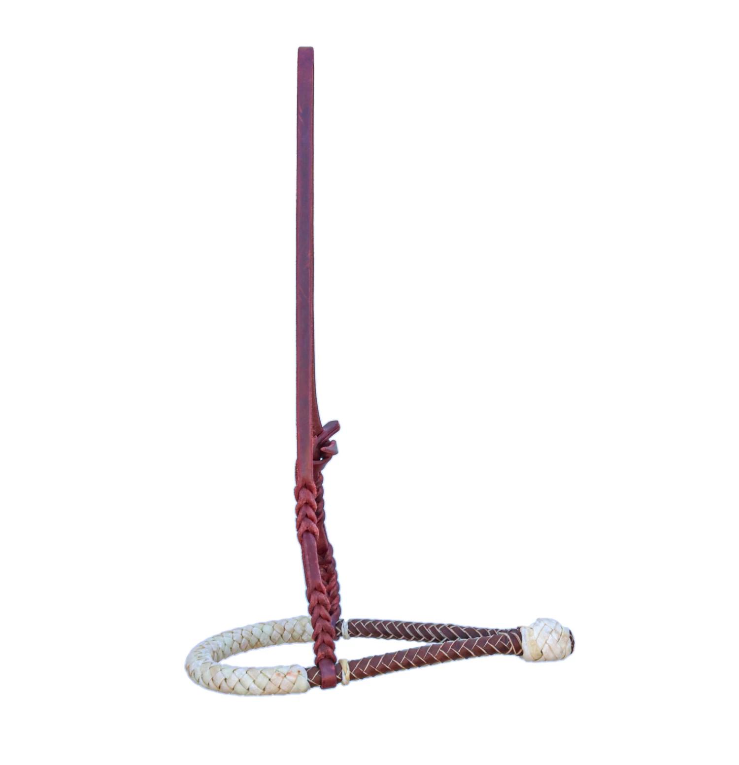 Bozal de piel cafe (1/2″ de ancho”) con cuero crudo trenzado en la nariz y la bola. Con banda de la cabeza ajustable.