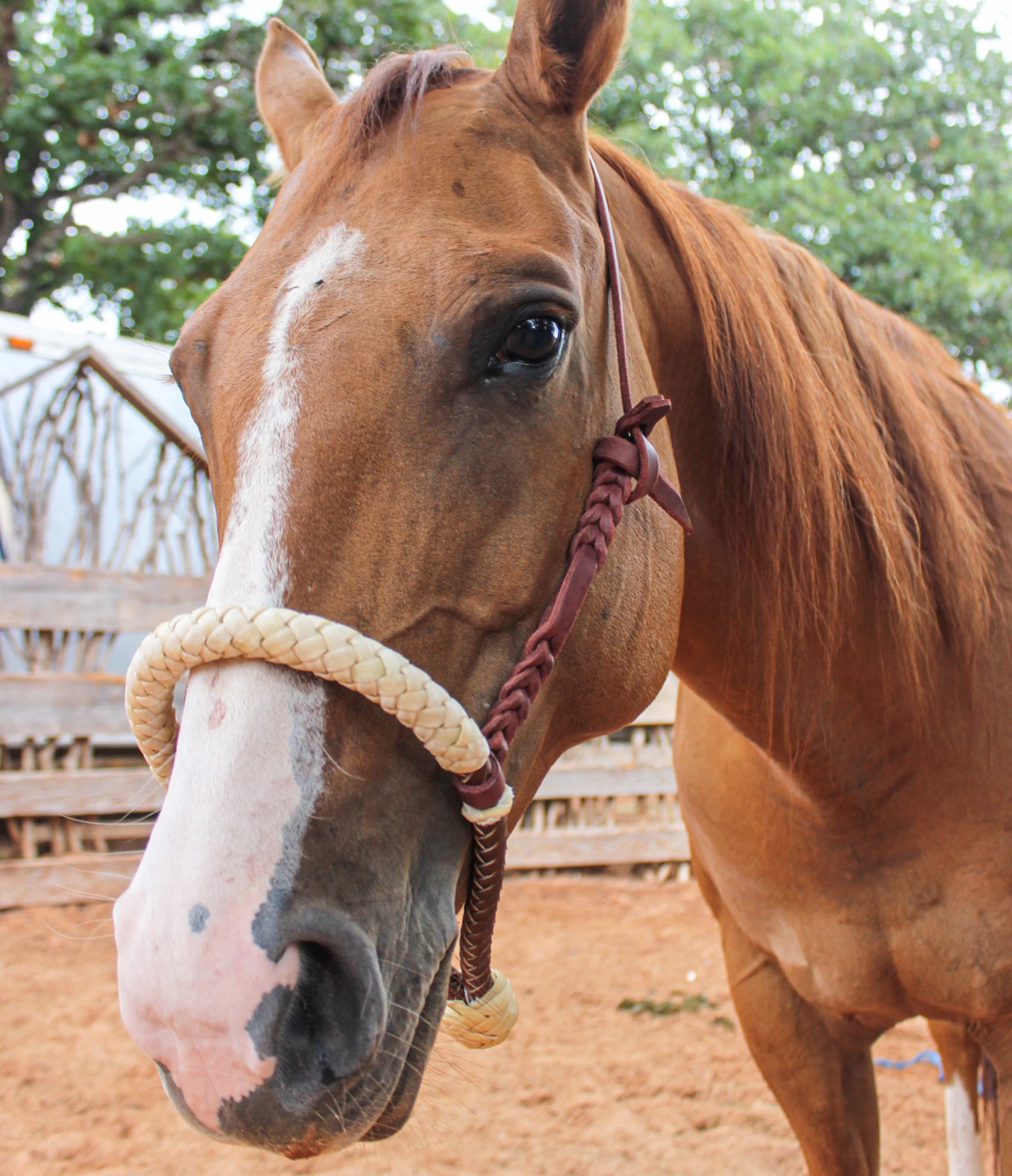 Brown Leather bozal (1/2″ width) with natural braided rawhide on nose and ball. With adjustable head band made of leather.