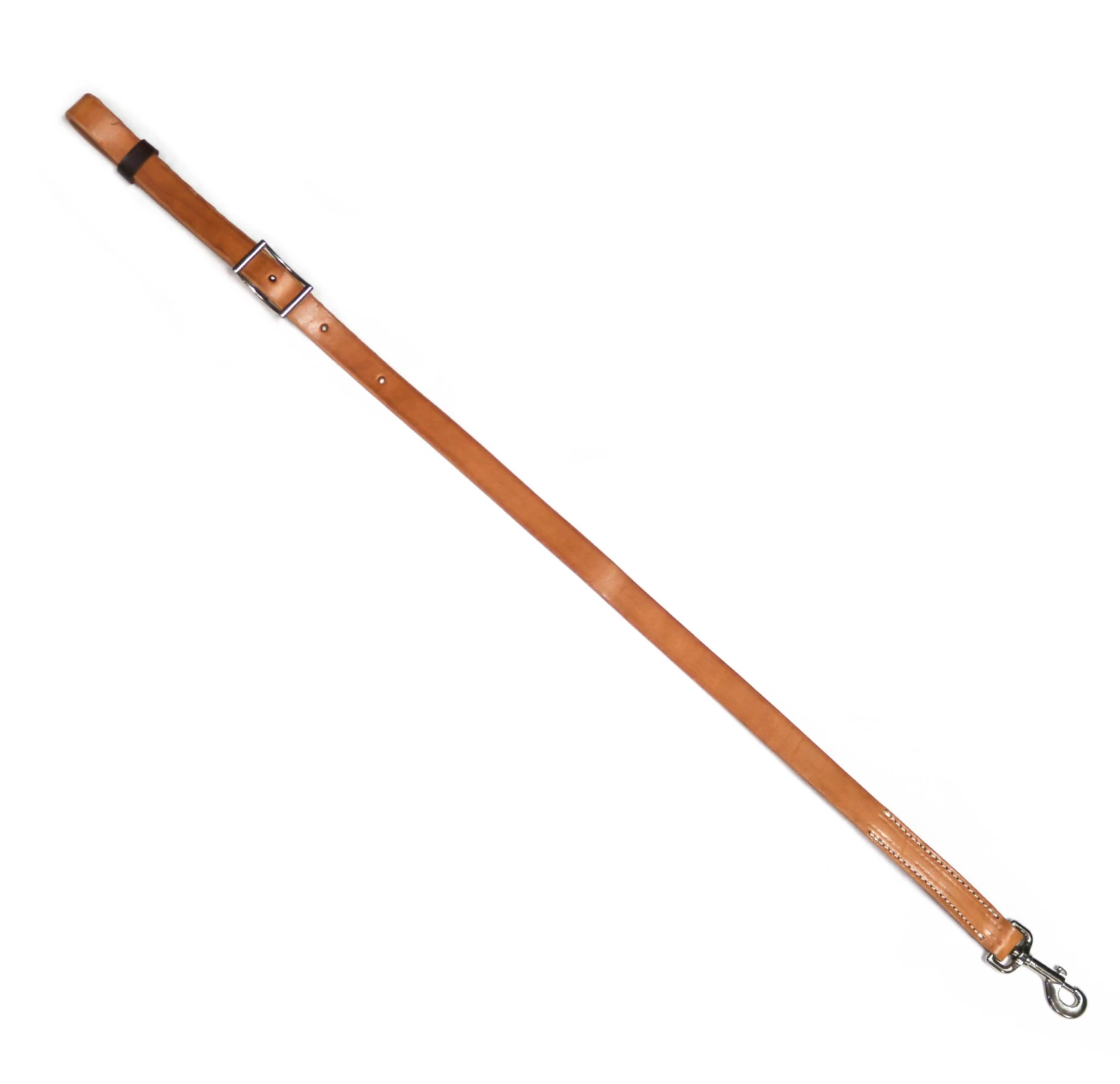 Russet Leather tie down strap. Adjustable from 15” – 25” in length. Available with nickel snap/conway and leather keeper. Made to go with western nosebands to connect from the noseband to cinch center ring.